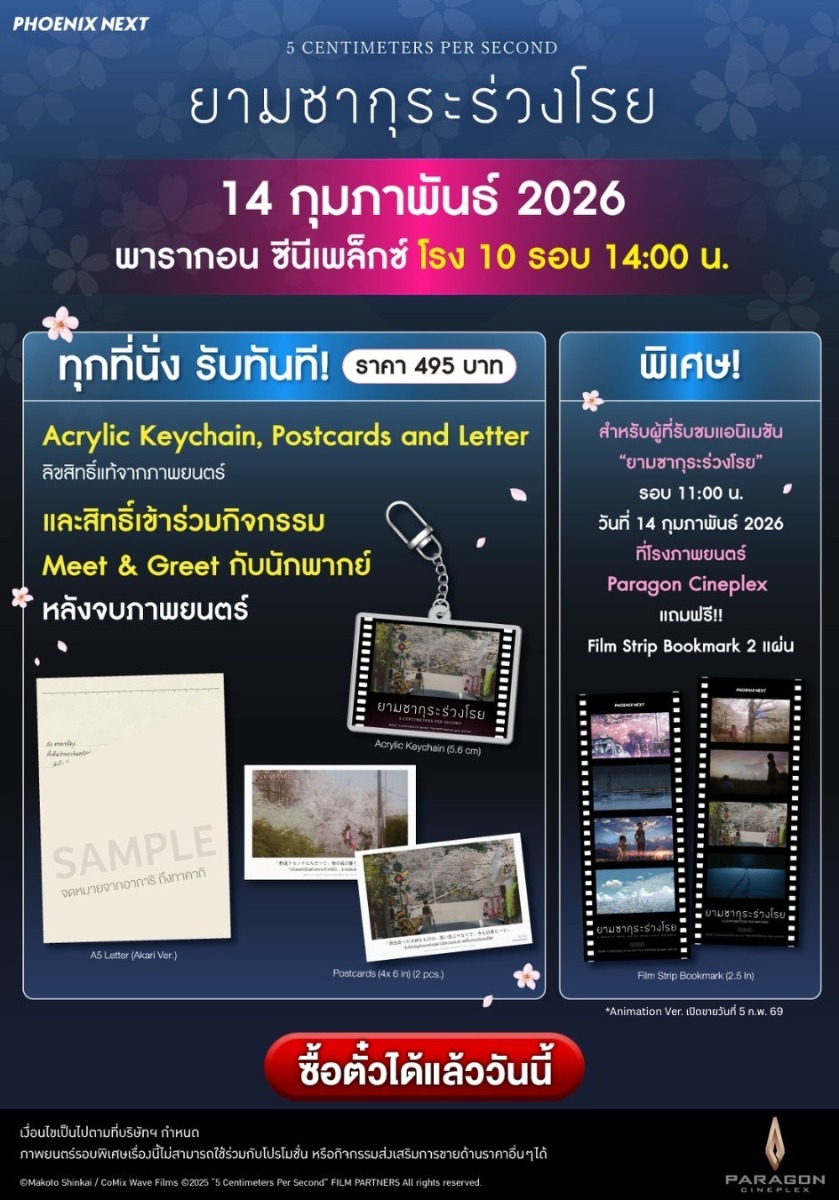 - ซื้อบัตรชมภาพยนตร์รอบพิเศษเรื่อง ยามซากุระร่วงโดย ฉบับไลฟ์แอคชัน (เสียงไทย) รอบ 14.00 น. พร้อมของพรีเมียมราคาพิเศษที่นั่งละ 495 บาท