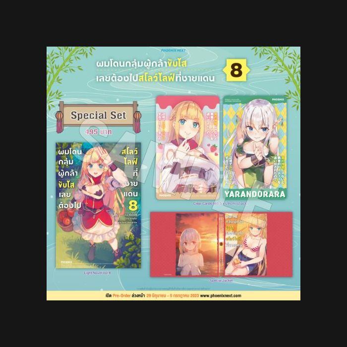 รายละเอียดของ Special Set ไลท์โนเวล "ผมโดนกลุ่มผู้กล้าขับไส เลยต้องไปสโลว์ไลฟ์ที่ชายแดน เล่ม 8" (Shin no Nakama janai to Yūsha no Party o Oidasareta node, Henkyō de Slow Life Suru Koto ni Shimashita vol.8 )