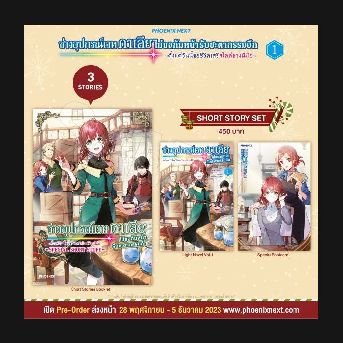 รายละเอียดของ Short Story Set ไลท์โนเวล “ช่างอุปกรณ์เวทดาเลีย ไม่ขอก้มหน้ารับชะตากรรมอีก ~ตั้งแต่วันนี้ขอใช้ชีวิตเสรีสไตล์ช่างฝีมือ~ เล่ม 1” (Madougushi Dahlia wa Utsumukanai: Kyou kara Jiyuu na Shokunin Life vol.1)